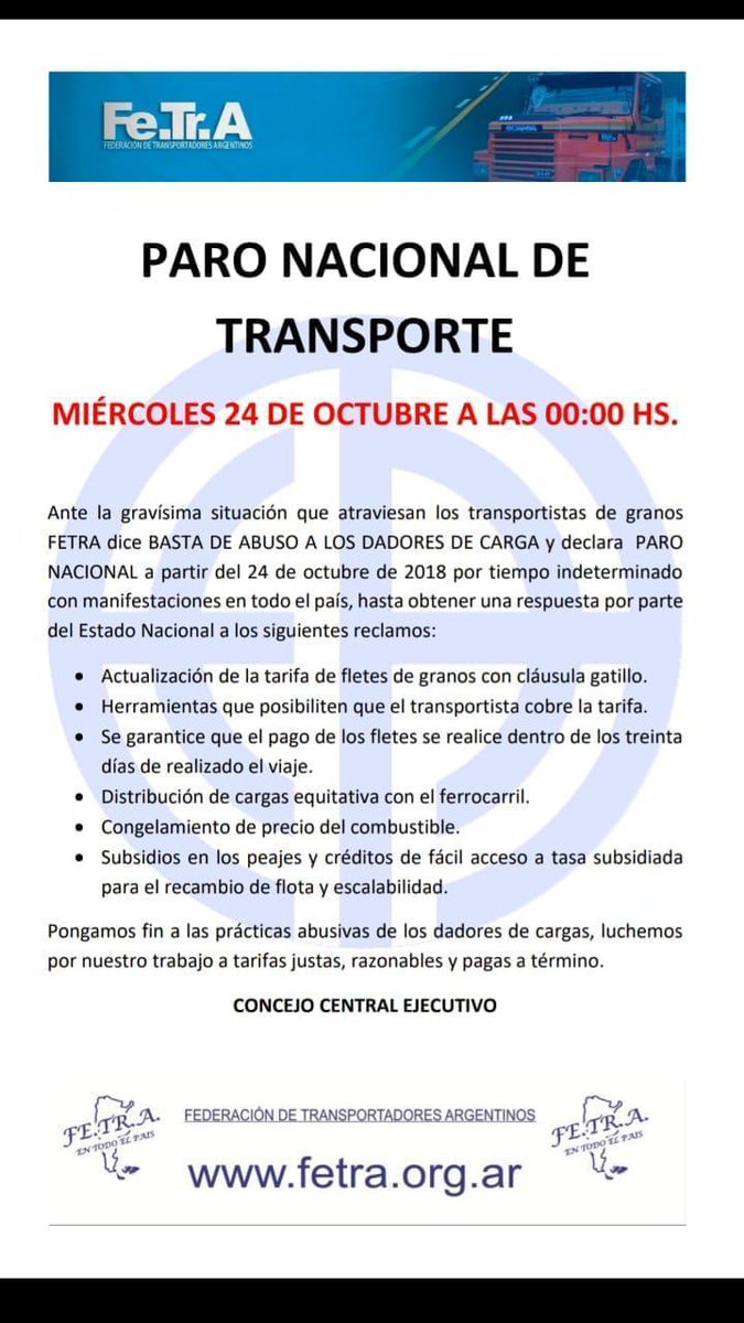 La Federación de Transportadores Argentinos realizará, a partir del miércoles 24 de octubre a las 00:00hs, un Paro Nacional por tiempo indeterminado con manifestaciones en todo el país. Los Transportistas reclaman por la “gravísima situación que atraviesan los transportistas de grano”.
