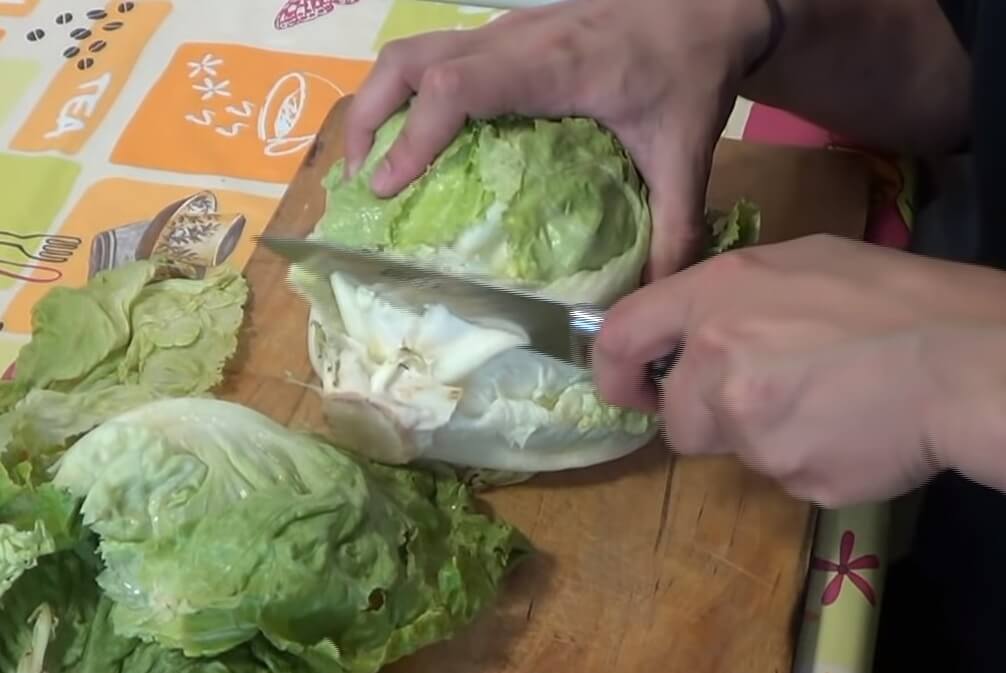 Primero le quitamos la capa externa de hojas, las cuáles se pueden comer tranquilamente. Para luego, cortar la lechuga a 2 dedos aproximadamente de la base.