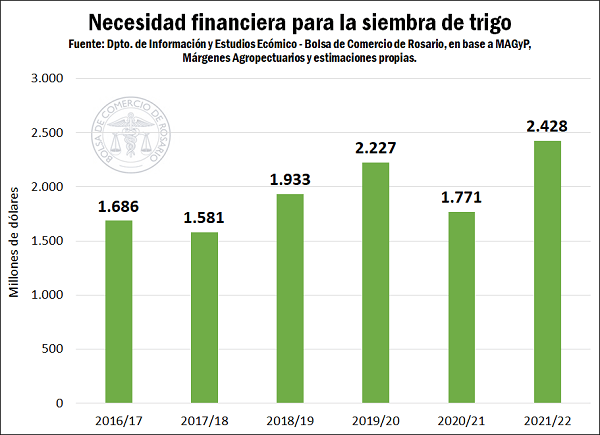 En la vereda opuesta, la bolsa rosarina señaló que uno de los factores limitantes reside en la disponibilidad de fondos, para maximizar el paquete tecnológico del cereal. En el promedio de las últimas cinco campañas, los productores desembolsaron algo más de U$S 1.800 millones para implantar el cultivo.