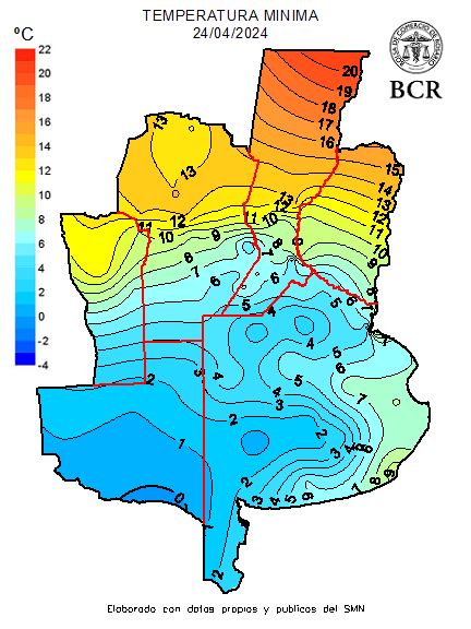 En la región núcleo, el detalle de las estaciones de la red GEA/BCR muestra los menores en el norte de Buenos Aires: Chacabuco registró 2,2°C; General Pinto 2,3°C y Lincoln 3°C.