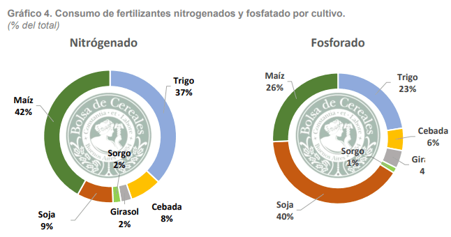 Por su parte, el resto del mercado estuvo compuesto por cebada con un 8%, girasol con un 4% y sorgo con un 2%, reflejando un menor peso relativo de estos cultivos en el uso de fertilizantes.