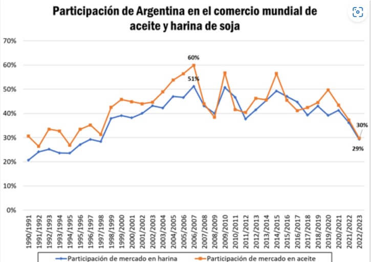 “Baja la participación de la molienda de soja dentro de los países del Mercosur. Cae la participación de Argentina en el comercio mundial de aceite y harina, al nivel más bajo desde 1998. Brasil será el primer exportador mundial de harina de soja, desplazando a la Argentina por primera vez en 30 años”, subraya el reporte.
