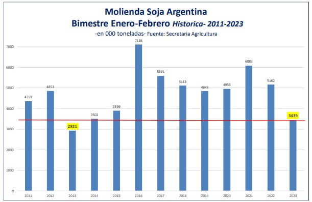 Por otro lado, ratifica también lo anticipado por Infocampo en relación a los pésimos números que mostró la molienda de soja en febrero: con apenas 1,55 millones de toneladas, fue el peor febrero de los últimos 13 años.