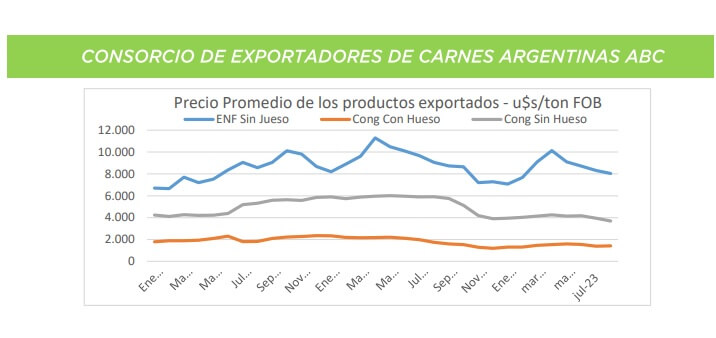 En el octaco mes del año, las exportaciones de carne congelada deshuesada sumaron 44.000 toneladas, por un valor de U$S 162,5 millones. El precio promedio de las exportaciones de carne bovina congelada sin hueso resultó cercano a los U$S 3.700 por tonelada.