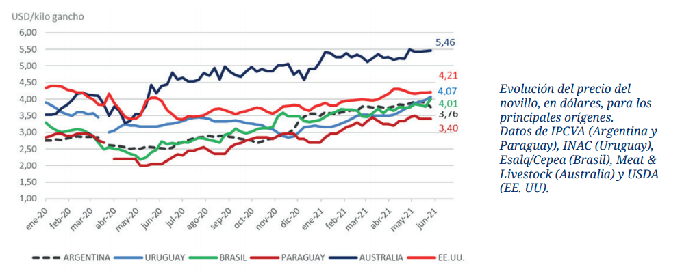 En el mismo lapso “el novillo argentino es el que marca los incrementos más moderados con apenas un 6% en lo que va de 2021, tomando los primeros valores de referencia escuchados tras el paro (u$s 3,76)”.