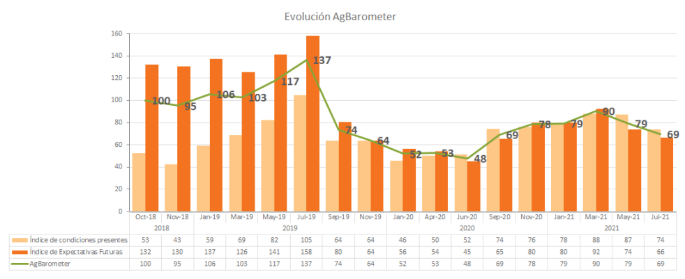 Cabe destacar de todas formas que la medición de julio de este año aún continúa mostrando valores muy por encima de lo medido en 2020, donde la percepción de los productores sobre las condiciones presentes están 42,3% por encima del año pasado, mientras que las expectativas futuras marcan un aumento del 46,7%.