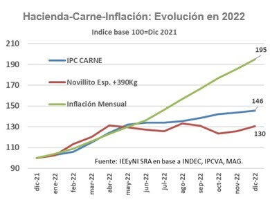 Pero para lo que algunos representa una fuerte suba, para otros es una recuperación de precios. La carne vacuna, a diferencia del resto de los alimentos, durante 2022 aumentó por debajo de la inflación, que cerró en 95%.