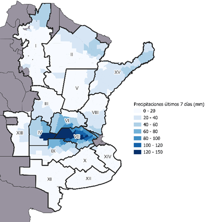 El máximo registro fue el de Bigand con 108,6 mm. En tanto, en numerosas estaciones del centro de la región núcleo y del sudeste cordobés, los totales en lo que va de octubre alcanzaron de 80 a 90 mm. Por otro lado, el mínimo registro fue el de General Pinto con 16 mm. En varias localidades del extremo norte bonaerense, los totales fueron de 16 a 20 mm.