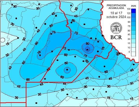 “Entre el 10 y el 17 de este mes, la región núcleo recibió en promedio 60 mm (de las 36 estaciones GEA/BCR), cuando octubre suele dejar en todo el mes 100 mm. Las lluvias fueron ampliamente superadoras a los pronósticos por un frente estacionario que se desplazó muy lentamente”, celebró la GEA.