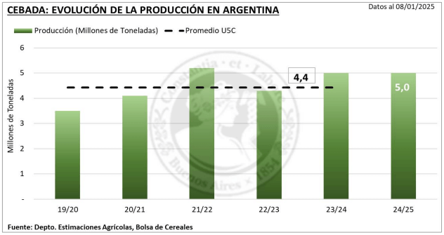 La cosecha de cebada 2024/25 acabó en unas cinco millones de toneladas, lo que implica la misma cantidad que en la campaña pasada y una cifra levemente por debajo de las 5,1 millones de toneladas que se pronosticaban al inicio del ciclo.