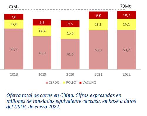 Según datos de la Administración General de Aduanas de China, durante 2021 el país asiático importó un total de 9,38 millones de toneladas de proteína animal, lo cual implica una caída del 5,34% respecto de 2020 cuando compró 9,91 millones.