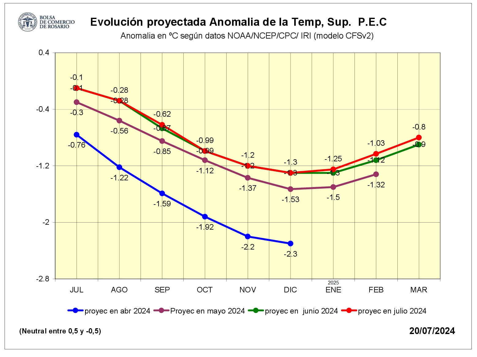 La “Niña” fuerte a muy fuerte que se preveía en abril quedó descartada. La anomalía actual para diciembre es de -1,3, cuando hace tres meses era de -2,3. Los nuevos datos también muestran una caída más abrupta del enfriamiento a partir de enero 2025 respecto a lo previsto un mes atrás.