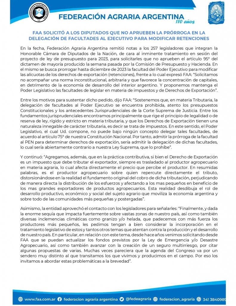 Del mismo modo, la Federación Agraria Argentina (FAA) emitió un extenso comunicado, en el que solicitó a los Diputados “que no aprueben la prórroga en la delegación de facultades al Ejecutivo para modificar retenciones”.