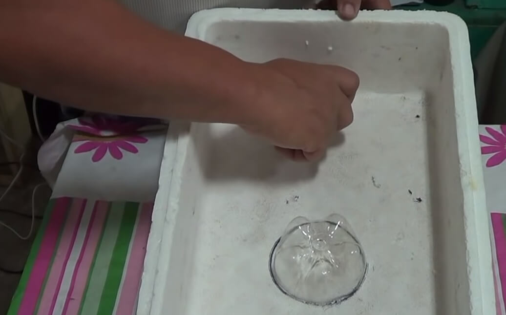 A la isla la ponemos por presión en el centro de la caja de lixiviados y con el pico de la botella, marcamos en una arista donde irá el desagüe y hacemos el agujero con un cuchillo. La idea es que el orificio quede un poco justo para que no pierda. Finalmente metemos el cuello a presión.