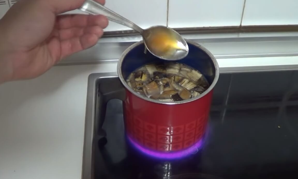 La cascara de banana la picamos y la metemos en una olla con un litro de agua durante 15 minutos. Si queremos podemos añadir una cucharada de miel como fuente de carbono, pero es totalmente opcional.