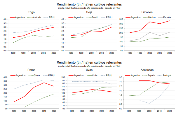 “En cuanto a cultivos regionales, hay algunos que han mejorado sus rendimientos, especialmente los de la región pampeana y limones en el NOA. Otros casos, asociados a economías regionales, muestran competitividad en descenso”, añade el economista.