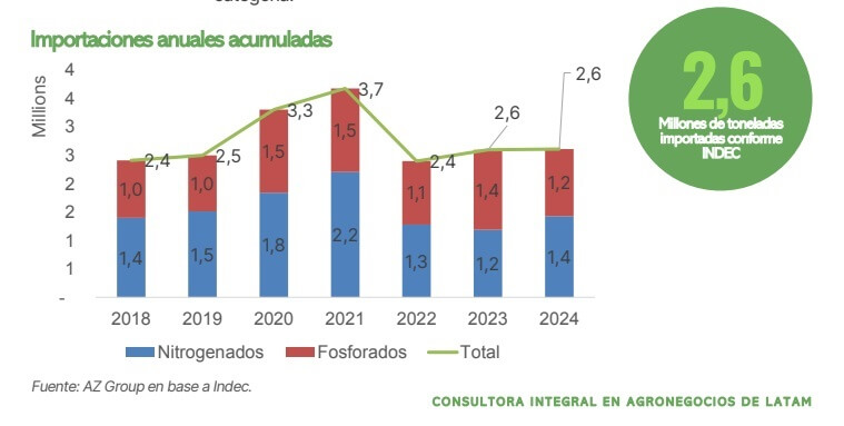 En lo que refiere a importaciones de urea, INDEC refleja un volumen importado total por 1,4 millones de toneladas, mientras que en fosfatados acumularon 1,2 millones.