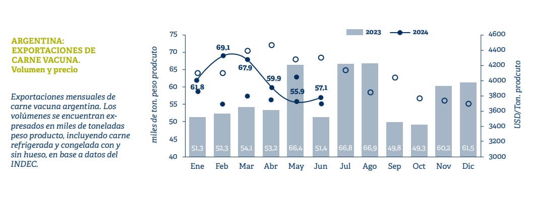En los dos últimos años, se consolidó un nuevo perfil de negocio con China, a partir de volúmenes relativamente altos, pero con precios que no terminan de recomponerse. En los primeros seis meses de 2024, los envios a este destino representaron el 76,1% del volumen despachado por los frigoríficos argentinos.
