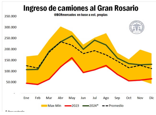 De acuerdo a un informe de la Bolsa de Comercio de Rosario (BCR), a partir de la recuperación productiva en la región centro del país, la zona del Gran Rosario recibirá algo más de 2,1 millones de camiones durante 2024.