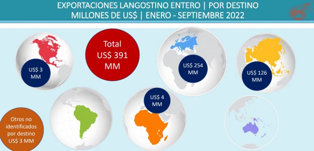 El principal destino de las exportaciones pesqueras en 2022 fue el mercado asiático, con ventas por U$S 534 millones, seguido por Europa con U$S 472 millones. En el continente americano, los envíos al centro y norte sumaron U$S 150 millones y en mercados de Sudamérica llegaron a U$S 126 millones.