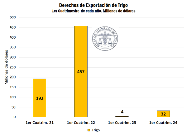 A partir de estos factores, la entidad rosarina calculó que la cadena triguera aportó el equivalente en pesos a U$S 32 millones por derechos de exportación en los primeros cuatro meses de 2024.