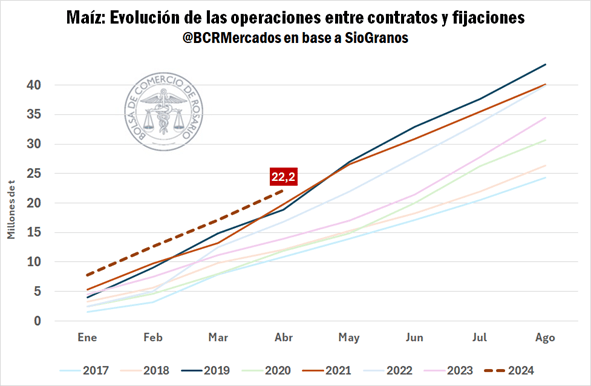 “Sin embargo, el frenético ritmo de operaciones sobre el mercado local ha llevado a marcar durante el mes de abril un récord, compensando el atraso en las anotaciones por maíz durante los últimos meses del 2023″, señalaron.