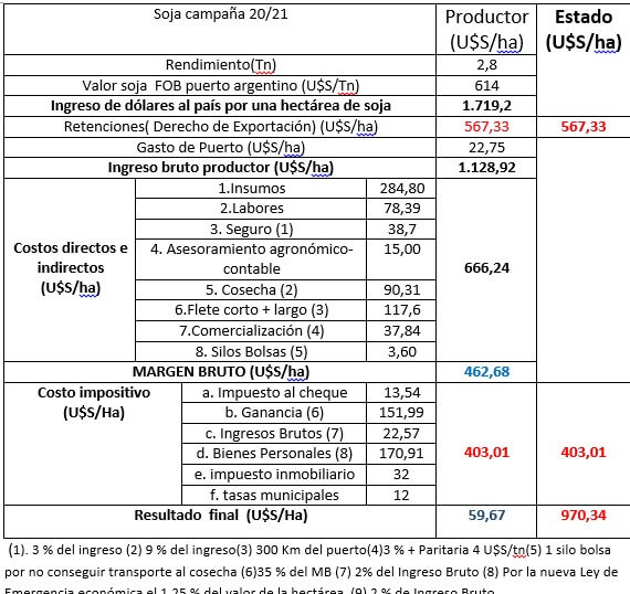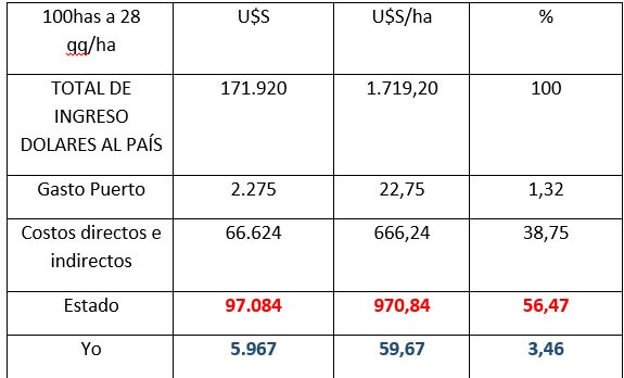 Pero de movida, de eso hay que descontar las retenciones y luego de pagar el gasto de puerto y otros costos directos e indirectos (insumos, flete, contador, silo bolsa, contratista), también otros impuestos (Ingresos Brutos, Ganancias, Cheque, Inmobiliario).