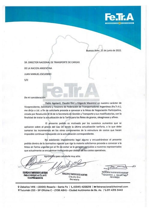 La Federación de Transportadores Argentinos (FETRA) informó que ya elevó ante la Dirección Nacional de Transporte de Cargas el pedido para reabrir la mesa de negociación de tarifas.