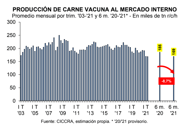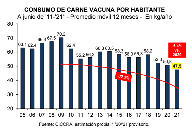 En junio de 2021 se produjeron 240,0 mil tn r/c/h de carne vacuna. “Considerando un descenso de las exportaciones a 50,0 mil tn r/c/h, la absorción del mercado doméstico habría sido de 190,0 mil tn r/c/h, esto indica que el consumo aparente por habitante habría sido equivalente a 49,7 kg/año, quedando casi 5% por debajo del nivel de doce meses atrás”, detalla la Cámara.