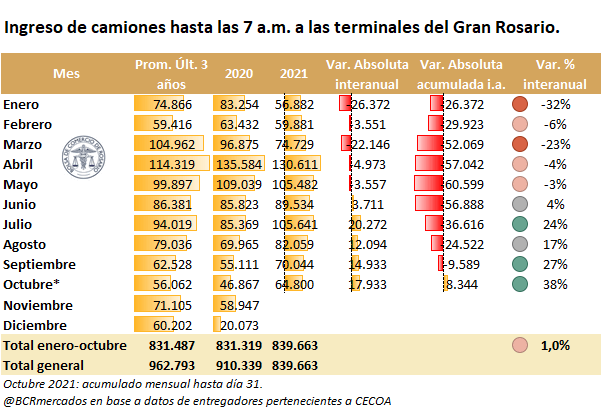 “Al mes de octubre no solo se alcanzó achicar la merma acumulada en el arribo de camiones sino que se superó lo obtenido el año previo con un total acumulado de 839.663 camiones, lo cual representa un incremento interanual del 1% respectivamente”, indica la BCR.
