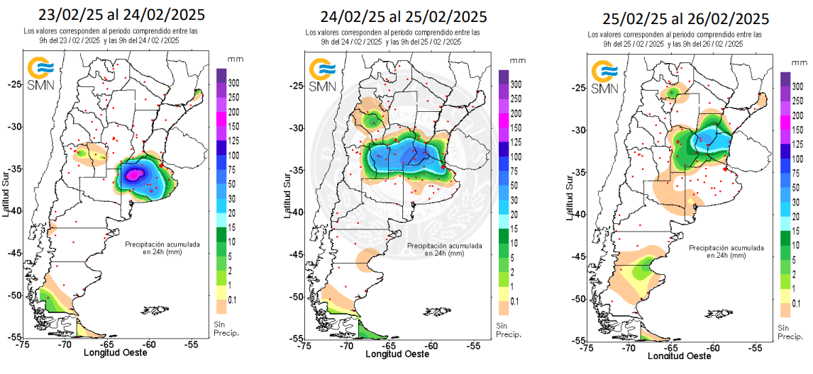 Por su parte, los mapas diarios de precipitaciones registrados por el Servicio Meteorológico Nacional (SMN) también muestran las zonas donde más llovió a lo largo de la última semana.