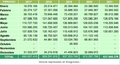 Cada mes, el Instituto Nacional de la Yerba Mate (INYM) publica la estadísticas comercialización y consumo de yerba mate. Según los últimos datos, el consumo interno acumula 164 millones de kilos entre enero y julio de 2021, superando ampliamente en ese lapso lo que pasó en los mejores años (2018 y 2019) de las últimas cinco temporadas (Ver Gráfico).