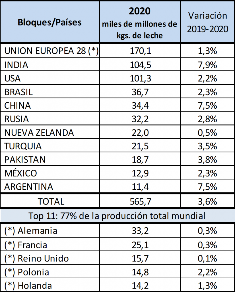 Por último, cabe mencionar que durante 2020 nuestro país ocupó el puesto once dentro del ránking de los principales productores de leche a nivel mundial, aumentando su producción un 7,5% respecto de 2019.