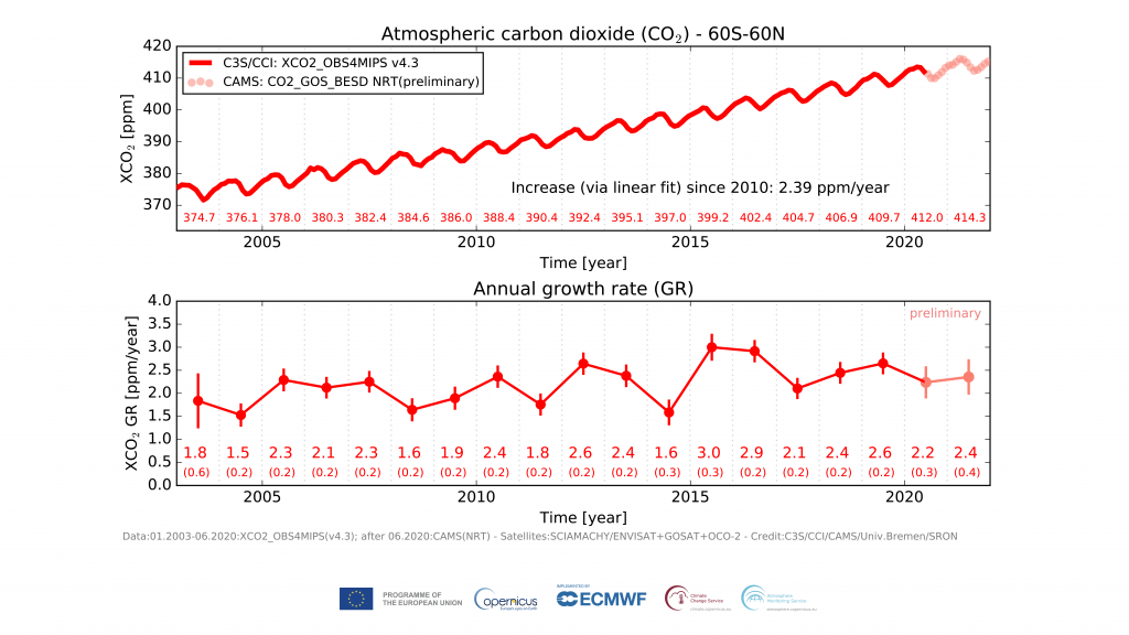 En detalle, las concentraciones de CO₂ en la atmósfera han aumentado a lo largo de 2021 hasta llegar a un pico de 414 partes por millón (ppm).