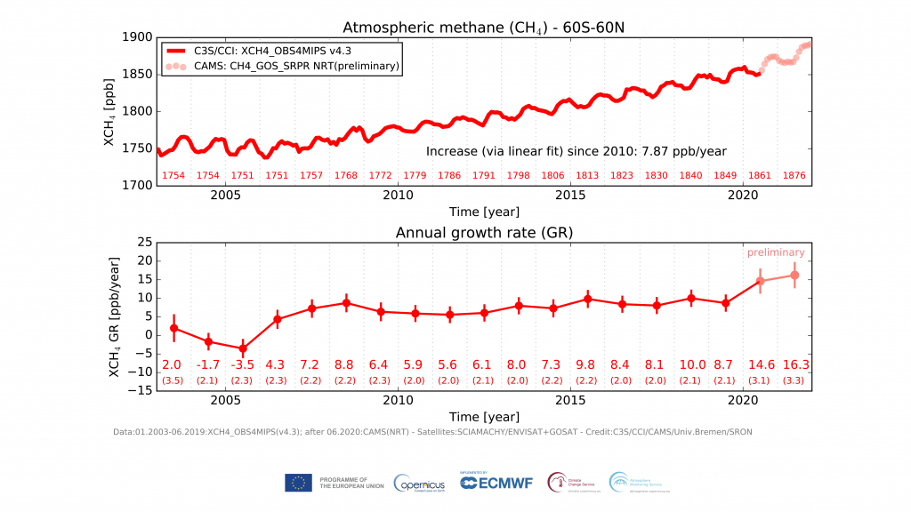 Como es de esperar, la elevada temperatura medida en 2021 coincide con un récord en la concentración de dióxido de carbono (CO₂) y metano (CH₄) en la atmósfera, causandos del Efecto Invernadero.