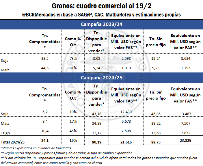 “En la foto actual del cuadro comercial para la 2024/25, teniendo en cuenta el track record de los últimos nueve años, las toneladas anticipadas de maíz y soja relativas a la oferta proyectada son las más bajas en ambos casos y la distancia respecto al promedio es de 7 puntos porcentuales para ambos”, detalló la Bolsa.