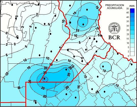 De acuerdo con la perspectiva agroclimática semanal de la Bolsa de Cereales de Buenos Aires, el frente de tormenta que está haciendo su paso, provocará “precipitaciones y tormentas de muy variada intensidad sobre la mayor parte del área agrícola, con registros muy contrastantes, alternándose focos de tormentas intensas, con áreas con aportes hídricos escasos a nulos”.