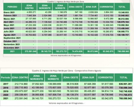 En lo que respecta a las cosechas, el informe del INYM refleja que en el mes de agosto ingresaron a los secaderos 130,1 millones de kilos de hoja verde, con lo cuál en los primeros ocho meses del año se llevan contabilizados un total de 768 millones de kilos.