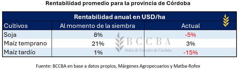 “En este escenario, la rentabilidad esperada para el productor se redujo respecto al momento de la siembra y en el caso de la soja de primera y el maíz tardío, con los precios y rendimientos actuales, la rentabilidad sería negativa”, afirmaron.