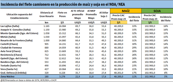Ambos tomaron como base las tarifas de fletes oficiales mencionadas y contrastando con los precios de referencia de los granos de la Cámara Arbitral de Cereales (CAC) de la Bolsa de Comercio de Rosario (se toma el precio promedio del mes de mayo), observaron que el costo de transporte de granos desde las zonas más alejadas de los puertos tiene una alta incidencia en el precio de la mercadería.