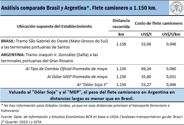 Además, si se extiende el análisis a un flete que recorra una distancia más larga (1.150 km), Argentina es más caro que Brasil si se utiliza la valuación al dólar oficial promedio de mayo (un 31% más caro), ya que, en Brasil, el costo de flete para distancias largas es de US$ 0,046 /t/km y en Argentina se ubica en US$ 0,060 /t/km.