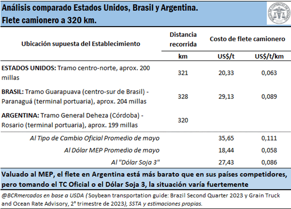 Este factor también incide en la comparativa con Brasil y Estados Unidos. Para ello se procedió a comparar el costo del flete para una distancia de 320 km o 200 millas en los tres países y comparar para una distancia de 1.150 km entre Argentina y Brasil. En el cálculo no se incluyó a Estados Unidos en este último porque en distancias largas el país norteamericano opta por otro tipo de transporte como el tren o la barcaza.