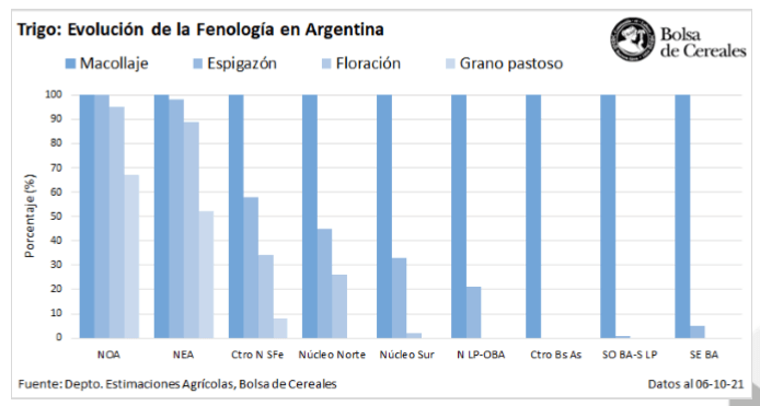 Para el caso del sur advirtió que “si bien se han registrado heladas más intensas, el 95 % del cereal se encuentra entre fin de macollaje y encañazón, por lo que se espera que no presente daños en espigas”, y por ende, en los rendimientos de los cultivos.