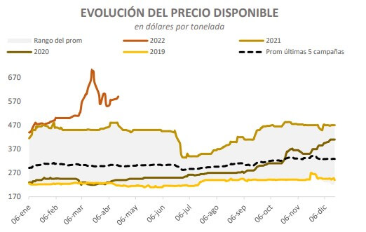 No obstante, el dato que está haciendo brillar a este cultivo es la fuerte suba de precios en el mercado internacional, apalancada fundamentalmente por el alza de los aceites oleaginosos y por el conflicto bélico en Ucrania, países de los que depende el 60% del comercio mundial.