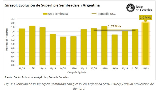 La superficie sembrada de girasol 2022/23 será de 2 millones de hectáreas, de acuerdo a un relevamiento de la Bolsa de Cereales de Buenos Aires (BCBA).