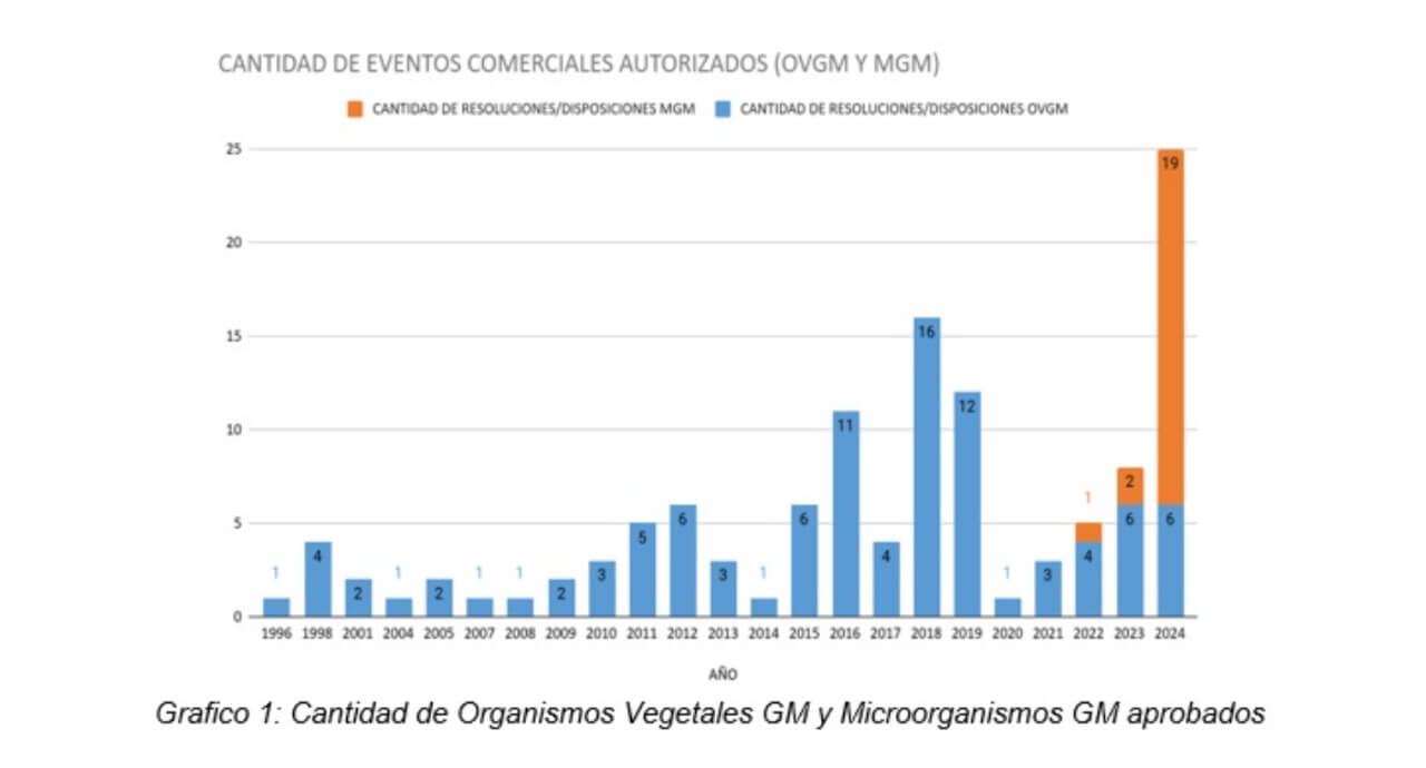 En 2024 se autorizaron 25 productos biotecnológicos, tanto en vegetales como en microorganismos. “Es una cifra que representa un hito histórico ya que constituye el 24,53% del total de aprobaciones en nuestro país en 28 años”, aseguraron.