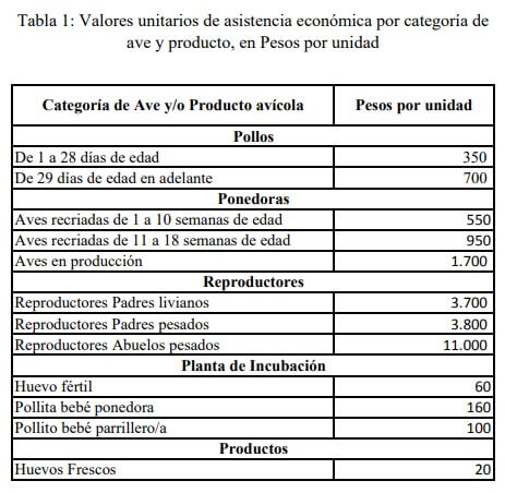El mismo se calculará en función de la cantidad de aves y/o huevos consignados en el acta respectiva del Senasa, multiplicada por los valores unitarios de compensación establecidos para cada categoría, según el siguiente detalle: