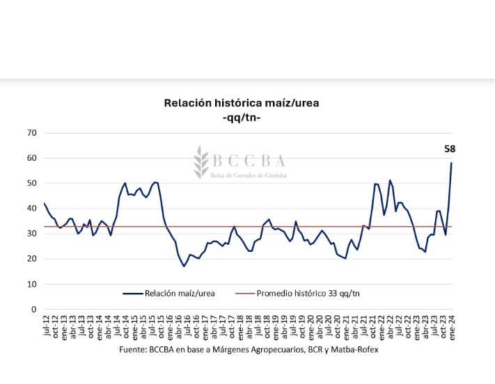 Bajo este panorama, la Bolsa de Cereales de Córdoba (Bccba) estimó que, en enero pasado, para comprar una tonelada de urea se necesitaron 58 quintales por hectárea del cereal.