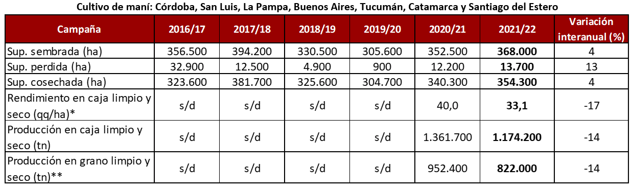 Un total de 1,2 millones de toneladas de maní en caja, limpio y seco, se produjeron en Argentina en la campaña 2021/22, lo que representa una caída del 14% en comparación con el ciclo anterior, según un informe de la Bolsa de Cereales de Córdoba.
