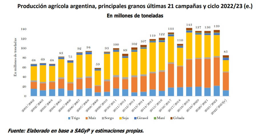 “Consolidando los siete granos más importantes, la producción podría estar ubicándose en los 85 millones de toneladas, una cifra que se ubica 38% por debajo del ciclo previo y que representa una pérdida de volúmenes del orden de los 53 millones de toneladas”, señalaron desde la entidad.